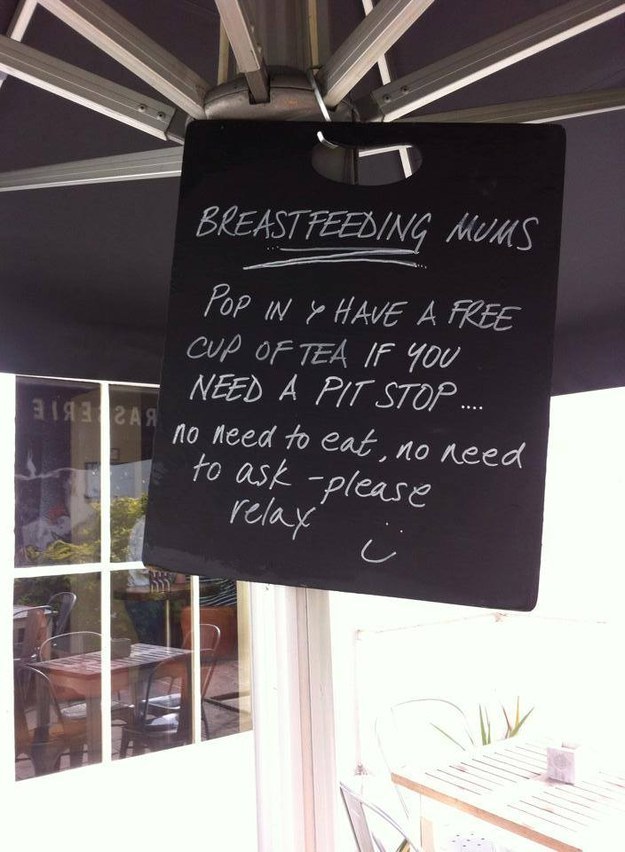 The restaurant manager told The Independent that she was inspired to hang the sign after serving a tired mom one day. "I made her a cup of tea and she looked like I'd given her am million pounds," Emm O'Connor said. “Sometimes you just need to sit down with your baby. Not everyone is as confident, and it’s not as easy for everyone. You can’t just sit on a park bench sometimes."